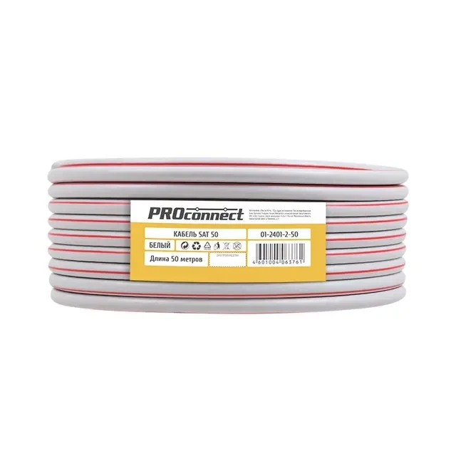 Кабель коаксиальный SAT 50M (75 Ом) PROconnect применяется для подключения спутниковых и кабельных телевизионных систем, камер видеонаблюдения и устройств, поддерживающих HDTV. Подходит для прокладки преимущественно внутри помещений. Обладает хорошими пропускными показателями и минимальным уровнем потери сигнала. Изготовлен из первичных материалов, имеет широкий диапазон рабочих температур и высокий уровень производительности. Состоит стальной проволоки, плакированной медью, находящейся в диэлектрике из вспененного полиэтилена. Поверх диэлектрика наложен экран из алюминиевой фольги, на котором располагается внешний проводник из алюминиевой проволоки в виде оплетки плотностью 75%. Материал внешней оболочки – ПВХ. Кабель белого цвета поставляется в мини-бухте длиной 50 м. Диаметр проволоки в оплетке: 0,12-0,15 мм.