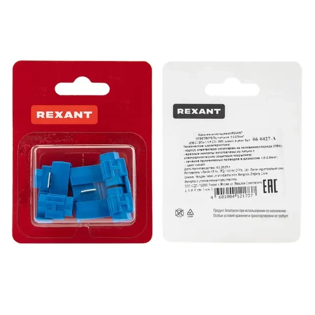 Ответвитель 1.0-2.5 мм² синий REXANT предназначен для ответвления электроэнергии от токонесущего провода с последующей подачей питания на дополнительное электрооборудование. Такой, применяемый в электрике и радиоэлектронике, ответвитель представляет собой пластиковый корпус, внутри которого расположен контактный нож. Монтаж осуществляется в считанные секунды: прокладываем провода в корпус (без предварительной зачистки); небольшим усилием на крышку, в ходе которого контактный нож прорезает изоляцию вложенных проводов, защелкиваем ее. После защелкивания соединение готово к эксплуатации. Технические характеристики: - корпус ответвителя изготовлен из поливинилхлорида (ПВХ); - врезные контакты изготовлены из латуни с электролитическим защитным покрытием; - сечение применяемых проводов в диапазоне 1.0-2.5мм²; - цвет синий; - Материал контактов: луженая латунь; - Максимально допустимый: 18 А/250В.