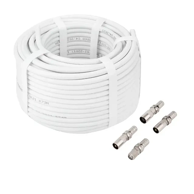 Комплект REXANT применяется для механического соединения ресиверов, ТВ-антенн, телевизоров и другого телевизионного оборудования с коаксиальным кабелем. Комплектация набора существенно облегчает и ускоряет процесс подключения техники. Все компоненты выполнены из никелированной меди, защищенной от окисления и появления ржавчины при эксплуатации в неблагоприятных условиях. Применение набора позволяет добиться приема ТВ-передач в высоком качестве без шумов и искажений. В состав комплекта входят: кабель RG-6 CCS 75Ом длиной 30 метров; F-разъем RG-6 – 4 шт; переходник (гнездо F - штекер TV) – 2 шт; переходник (гнездо F - гнездо TV) – 1 шт; переходник (гнездо F - гнездо F Бочка) – 1 шт.