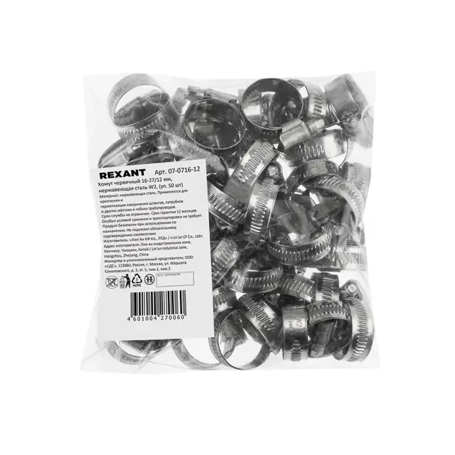 Описание REXANT 07-0716-12 - Купить Хомут червячный 16-27/12-0,8мм