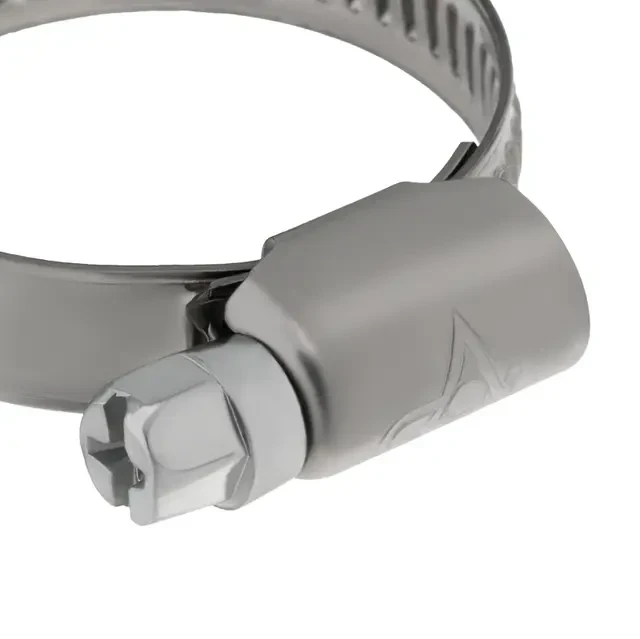 Хомут червячный из нержавеющей стали – это соединительный элемент, применяемый для крепления и герметизации соединения шлангов, патрубков и других жёстких и гибких трубопроводов. Используется для обжатия различных соединений в гидравлических и пневматических системах. Обеспечивает герметичность соединений в условиях умеренного и тропического климата. Конструктивно хомут состоит из ленты с зубчатой дорожкой, корпуса и специального винта для затяжки. Лента с зубчатой дорожкой изготовлена из нержавеющей стали W2 (AISI 430), а винт из оцинкованной стали. Ширина ленты составляет 12 мм.