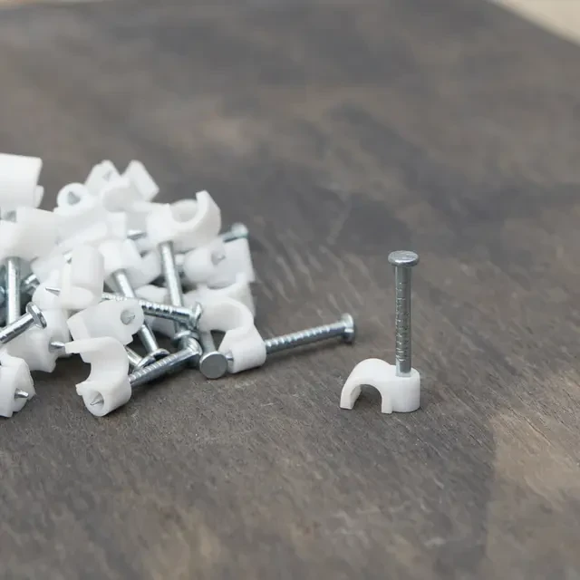 Круглый крепеж 3 мм с гвоздем предназначен для фиксации круглого кабеля к деревянной поверхности. Такой крепеж будет особенно полезен для использования на даче или в частном деревянном доме. Представляет собой дугообразную скобу белого цвета, выполненную из качественного пластика, с гвоздем в специальном отверстии. Скоба используется для мгновенного и надежного крепления проводов и кабелей к поверхностям стен, несущих конструкций и потолков. Гвоздь выполнен из закаленной стали, что позволяет закрепить его даже в плотной и твердой древесине без риска погнуть или сломать.