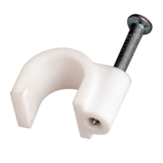 Круглый крепеж 8 мм с гвоздем предназначен для фиксации круглого кабеля к деревянной поверхности. Такой крепеж будет особенно полезен для использования на даче или в частном деревянном доме. Представляет собой дугообразную скобу белого цвета, выполненную из качественного пластика, с гвоздем в специальном отверстии. Скоба используется для мгновенного и надежного крепления проводов и кабелей к поверхностям стен, несущих конструкций и потолков. Гвоздь выполнен из закаленной стали, что позволяет закрепить его даже в плотной и твердой древесине без риска погнуть или сломать.
