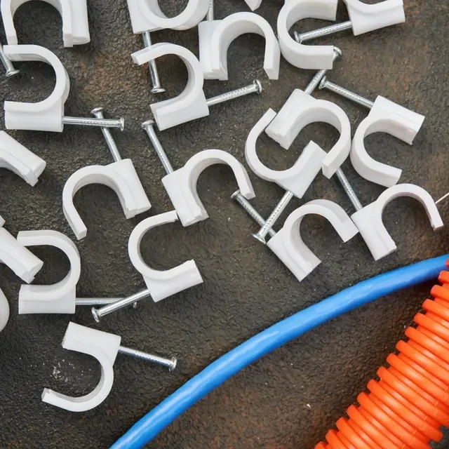Круглый крепеж 14 мм с гвоздем предназначен для фиксации круглого кабеля к деревянной поверхности. Такой крепеж будет особенно полезен для использования на даче или в частном деревянном доме. Представляет собой дугообразную скобу белого цвета, выполненную из качественного пластика, с гвоздем в специальном отверстии. Скоба используется для мгновенного и надежного крепления проводов и кабелей к поверхностям стен, несущих конструкций и потолков. Гвоздь выполнен из закаленной стали, что позволяет закрепить его даже в плотной и твердой древесине без риска погнуть или сломать.