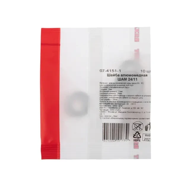 Шайба алюмомедная ШАМ 24/11 , REXANT предназначена для перехода с медного кабеля на алюминиевую шину или с алюминиевого кабеля на медную шину. Выполнена из электротехнической меди марки М1, М2и , электротехнического алюминия АД0-АД1. Исключает «гальваническую пару». Толщина: 2 мм Внутренний диаметр: 11 мм Наружный диаметр: 24 мм