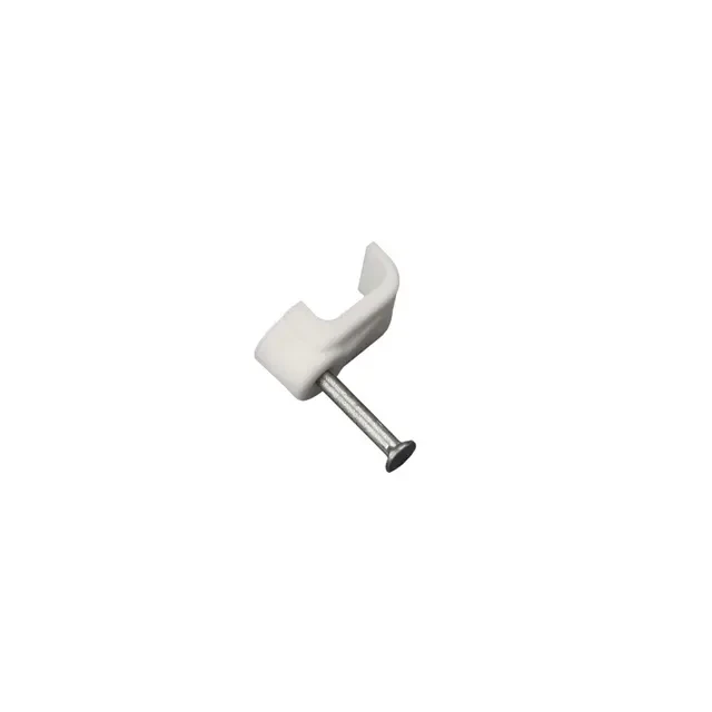 Плоский крепеж 10х4 мм с гвоздем предназначен для фиксации плоского кабеля к деревянной поверхности. Такой крепеж будет особенно полезен для использования на даче или в частном деревянном доме. Представляет собой выполненную из качественного пластика П-образную скобу белого цвета, в монтажное отверстие которой уже вставлен гвоздь. Скоба используется для мгновенного и надежного крепления проводов и кабелей к поверхностям стен, несущих конструкций и потолков. Гвоздь выполнен из закаленной стали, что позволяет закрепить его даже в плотной и твердой древесине без риска погнуть или сломать.