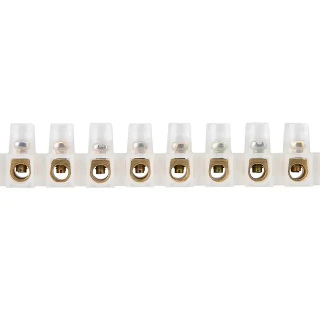 При проведении электромонтажных работ часто возникает необходимость соединения кабелей и проводов. Клеммная колодка, как нельзя лучше, справится с этой задачей. Она позволяет безопасно и надежно соединять несколько проводов между собой. При этом место соединения будет изолированным. Соединение осуществляется с помощью медных контактов. Кабели и провода фиксируются винтовым зажимом. Клеммная колодка изготовлена из полупрозрачного полиэтилена. Сечение соединяемых кабелей: от 1,5 до 4 мм² Максимальная сила тока: 3 Ампера