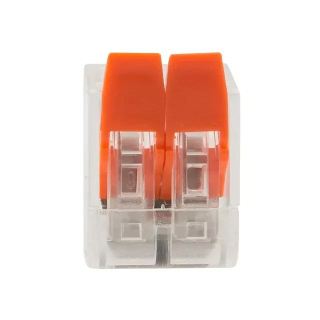 Многоразовая 2-проводная клемма REXANT — это один из самых быстрых, надежных и удобных способов монтажа проводников при небольшой потребности в пространстве в точке коммутации, в условиях нехватки и ограничения пространства. Конструкция на 30 % компактнее привычных рычажковых клемм, прозрачный корпус позволяет контролировать контакт проводников с контактными пластинами, правильность зачистки проводников. Широкие плоские рычаги с меньшим прижимным усилием более удобны и надежны в работе, наличие двух гнезд для тестовых щупов с обеих сторон клеммы облегчает доступ и контроль соединения и питания. Такие клеммы используются для соединения проводников сечением 0,14-4 мм², а также одножильных и тонкожильных проводников сечением 0,2-4 мм² (24–12 AWG), они могут передавать ток до 32 А/450 В при максимальной температуре до 85 °C. Характеристики: Размер: 13x9,5x19 мм Материал: Полиамид 66 Количество контактов: 2 Материал контактов: луженая медь Зажим: сталь Цвет: прозрачный Напряжение: 450 В Ток: 32 А Поддерживаемое сечение: 2x0,2-4 мм² (одножильный провод), 2x 0,14-4 мм² (многожильный провод) Длина зачистки изоляции: 11 мм Рабочая температура: –40...+85ºC