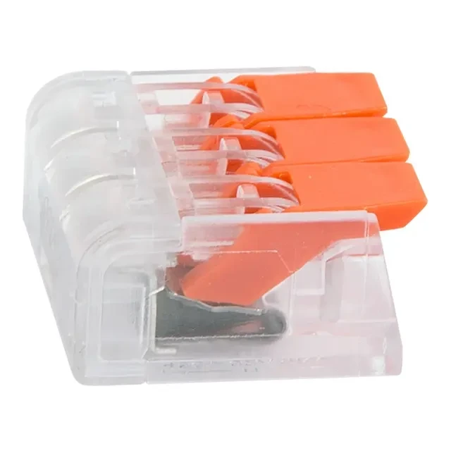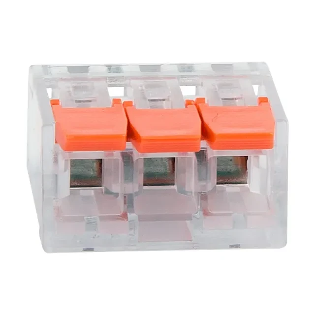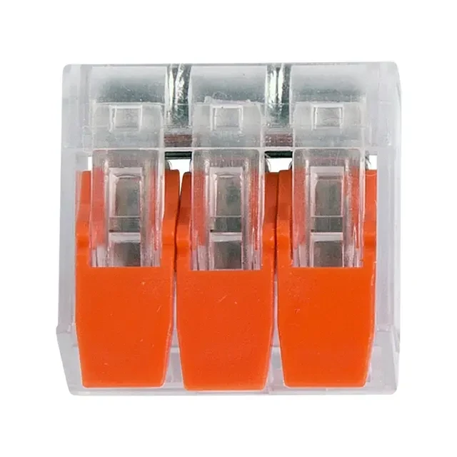 Многоразовая 3-проводная клемма REXANT это один из самых быстрых, надежных и удобных способов монтажа проводников при небольшой потребности в пространстве в точке коммутации, в условиях нехватки и ограничения пространства. Конструкция на 30 % компактнее привычных рычажковых клемм, прозрачный корпус позволяет контролировать контакт проводников с контактными пластинами, правильность зачистки проводников. Широкие плоские рычаги с меньшим прижимным усилием более удобны и надежны в работе, наличие двух гнезд для тестовых щупов с обеих сторон клеммы облегчает доступ и контроль соединения и питания. Такие клеммы используются для соединения проводников сечением 0,14-4 мм², а также одножильных и тонкожильных проводников сечением 0,2-4 мм² (24–12 AWG), они могут передавать ток до 32 А/450 В при максимальной температуре до 85 °C. Характеристики: Размер: 13x9,5x19 мм Материал: Полиамид 66 Количество контактов: 3 Материал контактов: луженая медь Зажим: сталь Цвет: прозрачный Напряжение: 450 В Ток: 32 А Поддерживаемое сечение: 3x0,2-4 мм² (одножильный провод), 3x 0,14-4 мм² (многожильный провод) Длина зачистки изоляции: 11 мм Рабочая температура: –40...+85ºC Поставляется в экономичной упаковке по 5 шт.