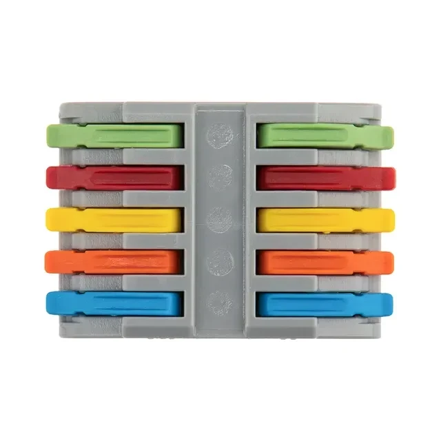 Многоразовые проходные клеммы REXANT предназначены для соединения медных одножильных и многожильных зачищенных проводников тонкого сечения. Состоит из 5 изолированных полюсов. Применяется для соединения или сращивания 5 пар проводов. Контакт осуществляется путем зажима проводника пластиной. Конструкция предотвращает случайное размыкание контакта. Специальное технологическое отверстие на корпусе клеммы предназначено для проверки соединения тестером-пробником или щупом мультиметра. Характеристики: Материал: Полиамид 66 Количество полюсов: 5 Материал контактов: луженая медь Зажим: сталь Цвет: серый Напряжение: 450 В Типы подключаемых проводов: одножильные, многожильные Ток: для одножильных проводов — 32 А, для многожильных проводов — 24 А Поддерживаемое сечение: 10x0.08-4 мм² (одножильный провод), 10x0.2-2,5 мм² (многожильный провод) Рабочая температура: –40...+85 °C Длина зачистки изоляции: 10 мм