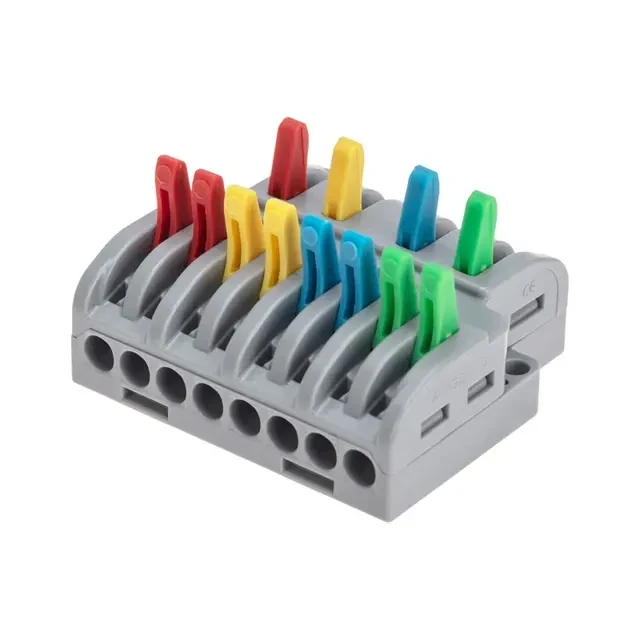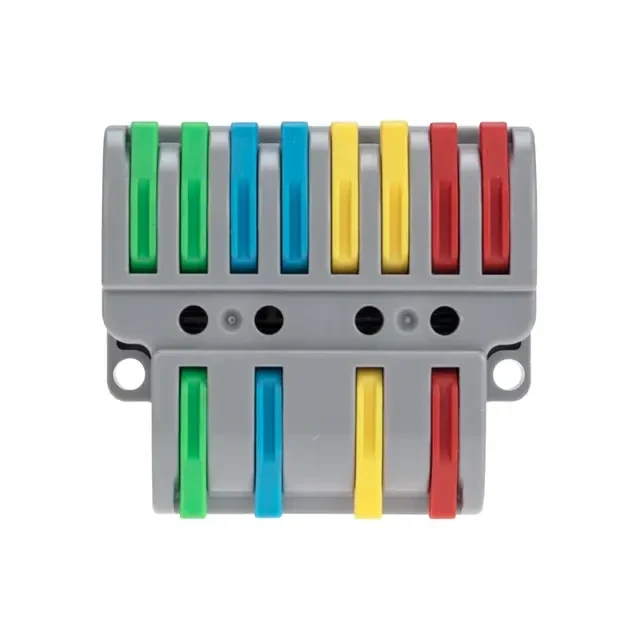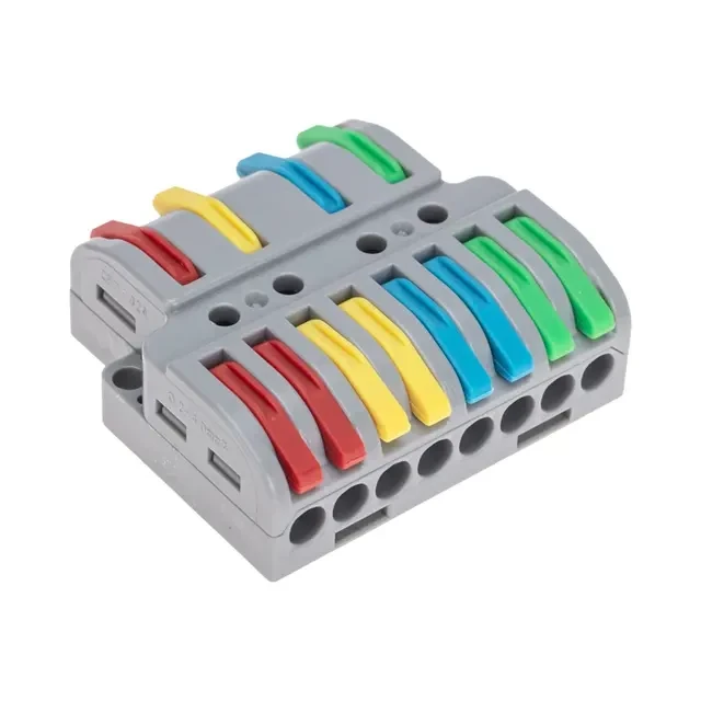 Многоразовые проходные разветвительные клеммы REXANT предназначены для соединения медных одножильных и многожильных зачищенных проводников. Состоит из 4 изолированных полюсов. Применяется для разделения связки из 4 пар проводов на 2 направления. Контакт осуществляется путем зажима проводника пластиной. Конструкция предотвращает случайное размыкание контакта. Специальное технологическое отверстие на корпусе клеммы предназначено для проверки соединения тестером-пробником или щупом мультиметра. Для удобства использования разные фазы клеммы имеют уникальную цветовую разметку. Характеристики: Материал: Полиамид 66 Количество полюсов: 4 Количество вводов: 12 Материал контактов: луженая медь Зажим: сталь Цвет: серый Напряжение: 450 В Типы подключаемых проводов: одножильные, многожильные Ток: для одножильных проводов — 32 А, для многожильных проводов — 24 А Поддерживаемое сечение: 2x0.14-4 мм² (одножильный провод), 2x0.2-2,5 мм² (многожильный провод) Рабочая температура: –40...+85 °C Длина зачистки изоляции: 10 мм