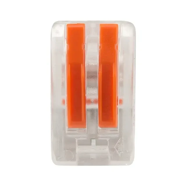 Соединительная многоразовая клемма REXANT на 2 проводника с плоско-пружинным зажимом в прозрачном корпусе предназначена для подсоединения медных одножильных и многожильных проводников тонкого сечения. Перед монтажом с соединяемых проводников необходимо снять изоляцию в соответствии с обозначениями на корпусе клеммы (9-12 мм). Зачищенный участок с монтажной стороны не должен иметь сильных изгибов. Вставьте его в свободное гнездо клеммы, предварительно подняв оранжевый рычажок, после этого опустите рычажок в исходное положение. Контакт осуществляется путем зажима проводника пластиной. Конструкция предотвращает случайное размыкание контакта. Специальное технологическое отверстие на корпусе клеммы предназначено для проверки соединения тестером-пробником или щупом мультиметра. Оболочка из прозрачного пластика делает контакт изолированным, а также позволяет визуально оценить положение проводника. Извлечение проводника (демонтаж) осуществляется действиями в обратном порядке. Характеристики: Размер: 12.4x14.5x20.5 мм Материал: Полиамид 66 Количество контактов: 2 Материал контактов: луженая медь Зажим: сталь Цвет: прозрачный Напряжение: 400 В Материал подключаемых проводов: Cu Типы подключаемых проводов: одножильные, многожильные Ток: для одножильных проводов — 32 А, для многожильных проводов — 24 А\28-12 AWG Поддерживаемое сечение: 2x0.08-4 мм² (одножильный провод), 2x0.08-2.5 мм² (многожильный провод) Рабочая температура: –40...+85 ºC