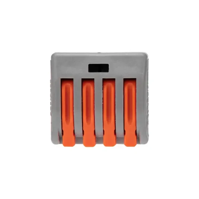 Соединительная многоразовая клемма СМК 22-414 тм REXANT на 4 проводника с плоско-пружинным зажимом предназначена для подсоединения медных одножильных и многожильных зачищенных проводников тонкого сечения. Перед монтажом с соединяемых проводников необходимо снять изоляцию в соответствии с обозначениями на корпусе клеммы (9-12 мм). Зачищенный участок с монтажной стороны не должен иметь сильных изгибов. Вставьте его в свободное гнездо клеммы, предварительно подняв оранжевый рычажок, после этого опустите рычажок в исходное положение. Контакт осуществляется путем зажима проводника пластиной. Конструкция предотвращает случайное размыкание контакта. Специальное технологическое отверстие на корпусе клеммы предназначено для проверки соединения тестером-пробником или щупом мультиметра. Корпус из пластика делает контакт изолированным. Характеристики: Материал: Полиамид 66; Количество контактов: 4; Материал контактов: луженая медь; Зажим: сталь; Цвет: серый; Напряжение: 400В; Типы подключаемых проводов: одножильные, многожильные; Ток: для одножильных проводов — 32А, для многожильных проводов — 24А; Поддерживаемое сечение: 4x0.08-4мм² (одножильный провод), 4x0.08-2.5мм² (многожильный провод); Рабочая температура: –40...+85 ºC.