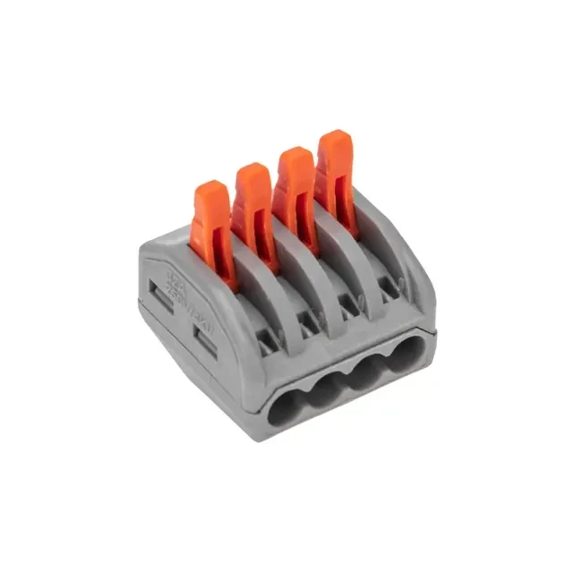 Соединительная многоразовая клемма REXANT на 4 проводника с плоско-пружинным зажимом предназначена для подсоединения медных одножильных и многожильных зачищенных проводников тонкого сечения. Перед монтажом с соединяемых проводников необходимо снять изоляцию в соответствии с обозначениями на корпусе клеммы (9-12 мм). Зачищенный участок с монтажной стороны не должен иметь сильных изгибов. Вставьте его в свободное гнездо клеммы, предварительно подняв оранжевый рычажок, после этого опустите рычажок в исходное положение. Контакт осуществляется путем зажима проводника пластиной. Конструкция предотвращает случайное размыкание контакта. Специальное технологическое отверстие на корпусе клеммы предназначено для проверки соединения тестером-пробником или щупом мультиметра. Корпус из пластика делает контакт изолированным. Для извлечения проводника (демонтажа) необходимо повторить указанные действия в обратном порядке. Характеристики: Материал: Полиамид 66; Количество контактов: 4; Материал контактов: луженая медь; Зажим: сталь; Цвет: серый; Напряжение: 400В; Типы подключаемых проводов: одножильные, многожильные; Ток: для одножильных проводов — 32А, для многожильных проводов — 24А; Поддерживаемое сечение: 4x0.08-4мм² (одножильный провод), 4x0.08-2.5мм² (многожильный провод); Рабочая температура: –40...+85 ºC.