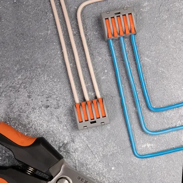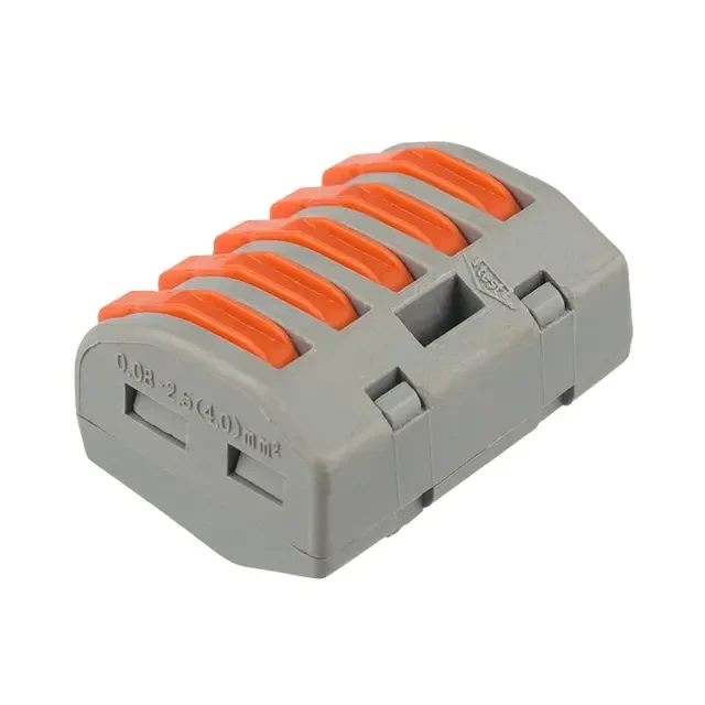 Соединительная многоразовая клемма REXANT на 5 проводников с плоско-пружинным зажимом предназначена для подсоединения медных одножильных и многожильных зачищенных проводников тонкого сечения. Перед монтажом с соединяемых проводников необходимо снять изоляцию в соответствии с обозначениями на корпусе клеммы (9-12 мм). Зачищенный участок с монтажной стороны не должен иметь сильных изгибов. Вставьте его в свободное гнездо клеммы, предварительно подняв оранжевый рычажок, после этого опустите рычажок в исходное положение. Контакт осуществляется путем зажима проводника пластиной. Конструкция предотвращает случайное размыкание контакта. Специальное технологическое отверстие на корпусе клеммы предназначено для проверки соединения тестером-пробником или щупом мультиметра. Корпус из пластика делает контакт изолированным. Извлечение проводника (демонтаж) осуществляется действиями в обратном порядке. Характеристики: Размер: 26,6x14.5x20.5 мм Материал: Полиамид 66 Количество контактов: 5 Материал контактов: луженая медь Зажим: сталь Цвет: серый Напряжение: 400 В Материал подключаемых проводов: Cu Типы подключаемых проводов: одножильные, многожильные Ток: для одножильных проводов — 32 А, для многожильных проводов — 24 А\28-12 AWG Поддерживаемое сечение: 5x0.2-4 мм² (одножильный провод), 5x0.14-2.5 мм² (многожильный провод) Рабочая температура: –40...+85 ºC