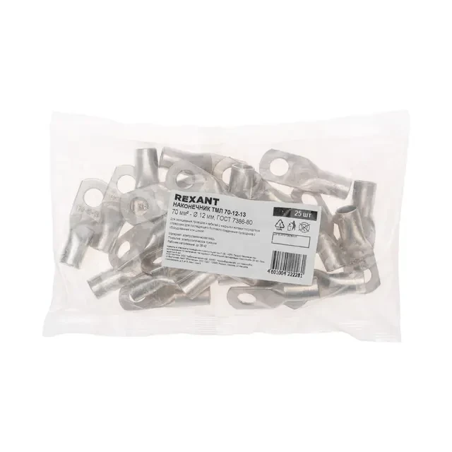 Наконечник ТМЛ 70–12–13 (70мм² - Ø12мм) REXANT предназначен для оконцевания проводов и кабелей с медными и алюминиевыми жилами посредством опрессовки для последующего болтового соединения проводника с оборудованием или шиной. Наконечник изготовлен из меди высокого качества, подвергнутой лужению, что улучшает электрический контакт, защищает изделие от окисления и коррозии, а также препятствует разрушению основного материала. Структура обозначения: Т — Труба — полуфабрикат, из которого изготовлен наконечник; М — Медь — материал, из которого изготовлен наконечник; Л — Луженый — покрытие; 70 — номинальное сечение наконечника, мм²; 12 — диаметр контактного стержня, мм; 13 — внутренний диаметр хвостовика, мм.