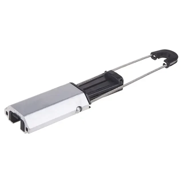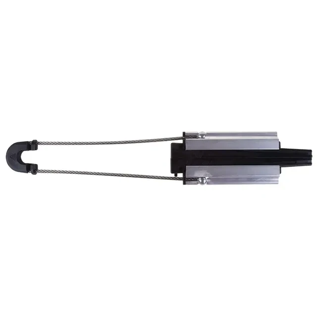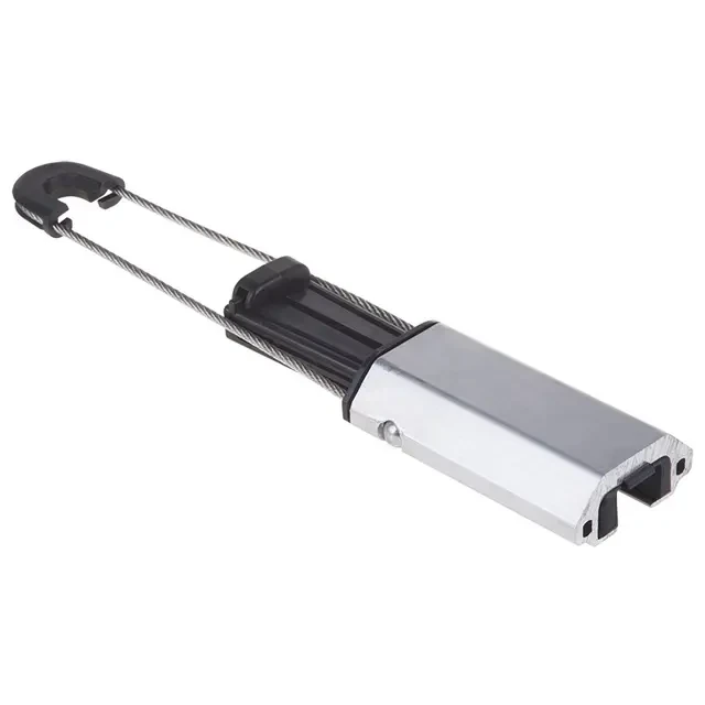 Предназначен для подвески самонесущих проводов типа СИП-2 на концевых и угловых опорах. Зажим рассчитан на монтаж и эксплуатацию при низких температурах. Корпус зажима изготовлен из коррозионностойкого экструдированного алюминиевого сплава, тросик из нержавеющей стали с шаровыми креплениями на обоих концах для удобства надежной фиксации. Внутренняя часть и саморегулирующиеся клинья из армированного диэлектрического пластика, устойчивого к ультрафиолетовому излучению. Не требуется инструмент для монтажа.