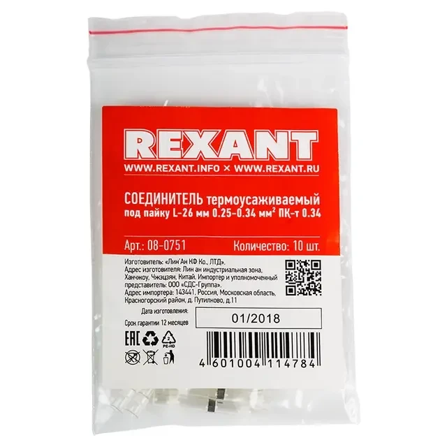 Описание REXANT 08-0751 - Купить Гильза кабельная изолированная ПК-т 0.34 термоусаживаемая под пайку