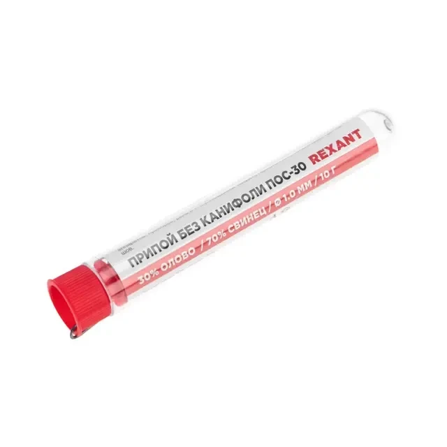 Припой без канифоли ПОС-30, 10г, ?1мм, (олово 30%, свинец 70%), колба REXANT