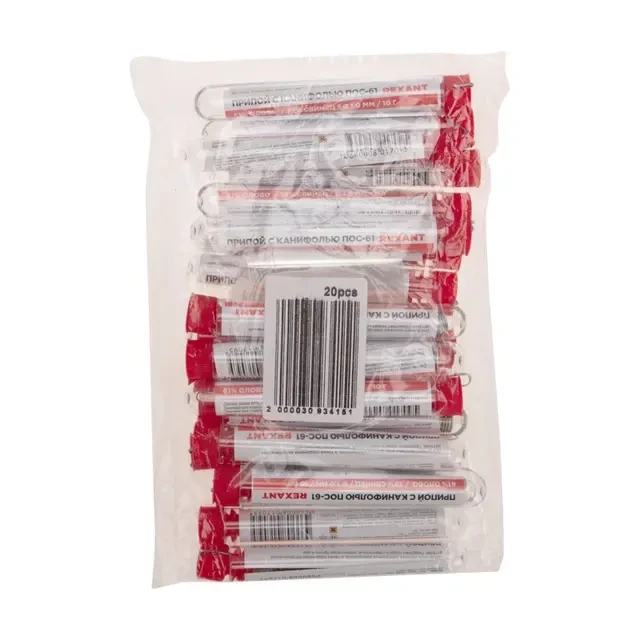 Припой ПОС-61 предназначен для пайки и лужения деталей электро- и радиоаппаратуры, точных приборов, печатных плат, медицинской техники. Особенно эффективен при работе с элементами, чувствительными к перегреву. Припой с канифолью REXANT представляет собой проволоку (диаметром 1 мм) из сплава олова (61 %) и свинца (39 %). Нагреваясь до температуры плавления (183...190 °С) припой: расплавляется, смачивает спаиваемый металл и, растекаясь по нему — заполняет место между соединяемыми деталями. В свою очередь флюс канифольный активный (MC-20A) помогает сделать паянное соединение более прочным! Убирая окислительную плёнку со спаиваемых поверхностей и защищая их от дальнейшего окисления при пайке. Содержание флюса в припое — 2,2 %. Как видно из вышесказанного припой с канифолью REXANT — самое что ни на есть «два в одном»: припой и флюс в колбах по 10 грамм.