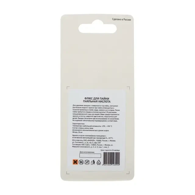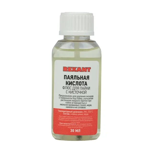 Паяльная кислота REXANT является одним из самых распространенных флюсов для пайки. Предназначена для удаления оксидов с поверхности под пайку и улучшения растекания жидкого припоя при пайке углеродистых и низколегированных сталей, меди, никеля и их сплавов. Применяется при пайке и лужении деталей припоями оловянно-свинцовой. Изготовлена в соответствии с ОСТ 4Г 0.033.200. Температура наибольшей активности: +290...+350°С. После пайки рекомендуется смыть остатки кислоты 5% раствором кальцинированной соды. Высокая проникаемость флюса позволяет легко обработать контакт в самых труднодоступных местах, а агрессивность способствует быстрому разрушению оксидной пленки на поверхности металла. Основные компоненты: хлорид цинка и вода. Вариант фасовки – флакон объемом 30 мл. Крышка оснащена кисточкой для удобного нанесения.