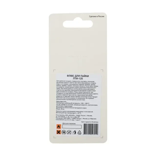 Флюс ЛТИ-120 REXANT предназначен для удаления оксидов с поверхности под пайку, улучшения растекания жидкого припоя и защиты нержавеющих сплавов, меди и ее сплавов, оцинкованных изделий, нихрома, свинца, никеля, серебра, кадмия, палладия, висмута от воздействия внешней среды. Изготовлен в соответствии с ТУ 84-406-73. Данный низкотемпературный флюс применяется при пайке и лужении деталей в радиоэлектронике. После пайки смывка не требуется: остатки флюса послужат защитным покрытием мест пайки. При необходимости растворяется спиртом или ацетоном. Преимущества: не проводит ток, поэтому широко применяется при пайке печатных плат и радиоаппаратуры; повышает прочность соединений. Температура наибольшей активности: +200...+300°С. Состав: канифоль сосновая, связующая жидкость, триэтаноламин, диэтиламин гидрохлорид. Вариант фасовки – флакон 30 мл. Крышка оснащена кисточкой для удобного нанесения.