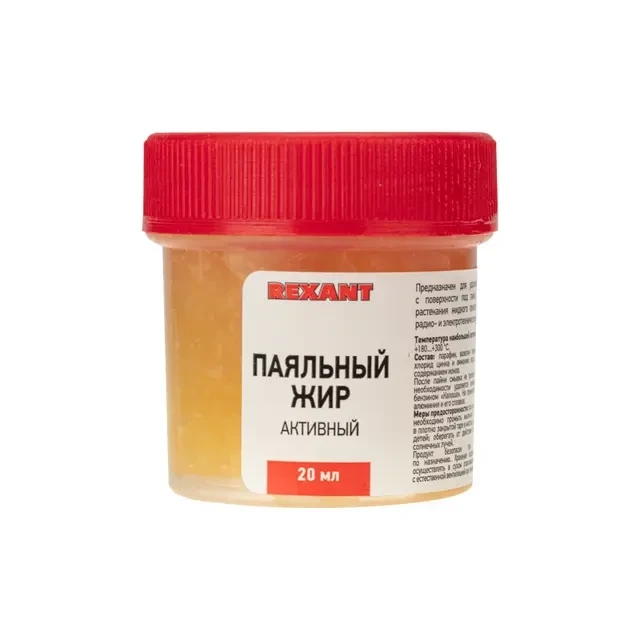 Активный паяльный жир предназначен для удаления оксидов с поверхности под пайку, улучшения растекания жидкого припоя при пайке сильно окисленных деталей, черных и цветных металлов, углеродистых сталей, меди и никеля. Используется для замены паяльной кислоты. Не применяется для пайки алюминия, его сплавов и электротехнической аппаратуры! Изготовлен в соответствии с ГОСТ 19250-73. Хорошо держится на металлических контактах, обеспечивая точное дозирование и высокую скорость нанесения. Ускоряет процесс лужения контактов, медленно испаряется на жале, не оставляя нагара. Остатки флюса удаляются спиртовыми растворами или смывочными жидкостями. Температура наибольшей активности: +150…+350°С. Состав: вазелин технический (ВТВ-1), парафин, хлорид цинка, хлорид аммония и вода деионизованная. Фасовка – банка 20 мл. Флюс с таким же составом выпускают известные фирмы: Stannol, Felder, CHEMET, ERSA, GOOT.
