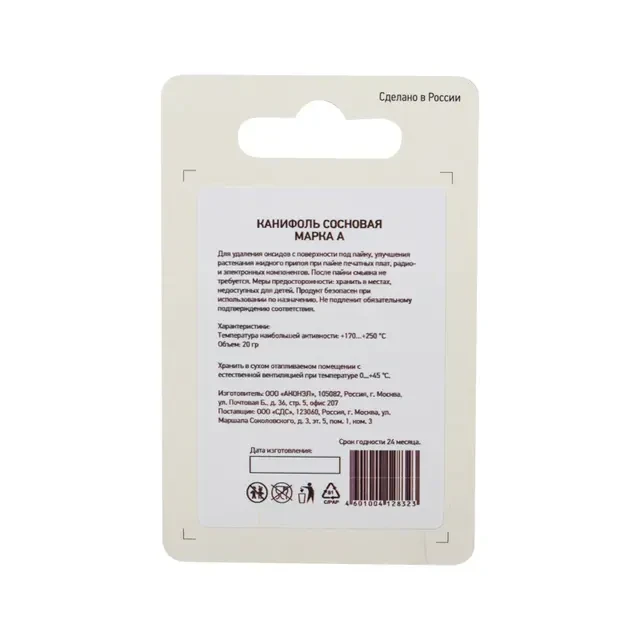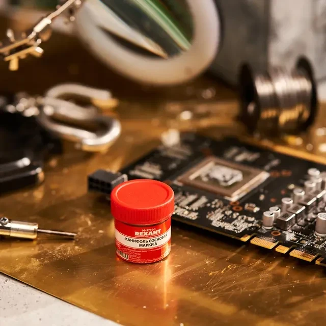 Канифоль сосновая марки А REXANT предназначена для удаления тонких и нестойких оксидов с поверхности под пайку, улучшения растекания жидкого припоя при пайке печатных плат и радиокомпонентов. Изготовлена в соответствии с ГОСТ 19113-84. Канифоль представляет собой хрупкое стекловидное вещество от темно-красного до светло-желтого цвета, применяемое в качестве нейтрального флюса при пайке и лужении деталей и поверхностей оловянно-свинцовыми припоями. Изготовляется из смол хвойных деревьев. После пайки смывка не требуется. Обладает следующими преимуществами: повышает прочность соединений; не образует вредных испарений при нагреве; не ухудшает электропроводимость места пайки; применяется при соединении легкоплавких контактов. Температура наибольшей активности: +170...+250°C. Вариант фасовки – банка с крышкой, вес нетто 20 г. При использовании необходимо соблюдать меры предосторожности.