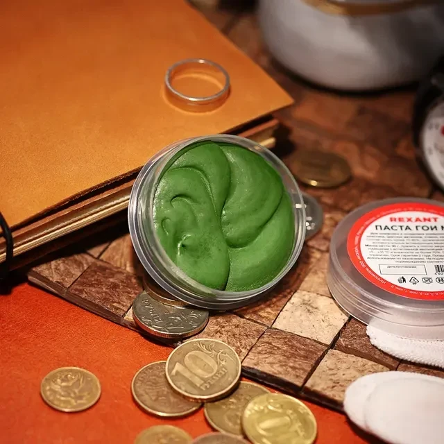 Паста ГОИ № 3 (аббревиатура от Государственный Оптический Институт) – это абразивный материал, применяемый для шлифовки и полировки поверхностей стали, пластика, цветных металлов, стекол, керамики и т. д. Основными компонентами являются оксид хрома, различные связующие и другие дополнительные компоненты. Широкое применение паста ГОИ получила благодаря простоте применения, возможности в домашних условиях производить шлифовку и полировку поверхностей. Подбор полировальной пасты: ВНИМАНИЕ! Важно правильно подобрать пасту с соответствующим уровнем абразивности. Использование по ошибке крупных частиц и (или) чрезмерного усилия, может привести к повреждению поверхности. В зависимости от абразивных качеств паста подразделяется на следующие типы: ПАСТА № 1 («тонкая» или «финишная»). Имеет почти черный цвет с зеленоватым отливом и абразивность 0.3-0.1 мкм. Содержание оксида хрома от 65 до 75%. Применяется для чистовой, зеркальной полировки. ПАСТА № 2 («тонкая»). Материал темно-зеленого цвета, имеющий абразивность 7.0-1.0 мкм. Содержание оксида хрома от 65 до 77%. Применяется для тонкой доводки поверхности с приданием зеркального блеска. ПАСТА № 3 («средняя»). Имеет зеленый цвет и абразивность 17.0-8.0 мкм. Содержание оксида хрома от 70 до 80%. Применяется для создания чистой поверхности и получения равномерного блеска. ПАСТА № 4 («грубая»). Материал светло-зеленого цвета, имеющий абразивность 40.0-18.0 мкм. Содержание абразива от 75 до 85%. Используется для получения матовой поверхности и удаления мелких царапин. Технические характеристики: Внешний вид: твердая масса зеленого цвета Состав: окись хрома 70-80%, органические связующие и вспомогательные активирующие вещества 30-20% Масса нетто: 30 г РЕКОМЕНДУЕМЫЙ ПОРЯДОК РАБОТ 1. Нанести небольшое количество пасты на полировальный круг, фланелевую ветошь, либо другой аналогичный мягкий материал. Не следует наносить пасту непосредственно на обрабатываемую поверхность. 2. В некоторых случаях, для растворения пасты, допустимо предварительно смочить круг или ветошь керосином или бензином. 3. Для равномерного распределения, разотрите нанесенную на ветошь или круг пасту о металл. Это необходимо для удаления крупных кусков абразивного материала способного повредить поверхность. 4. Добавьте небольшое количество индустриального масла на обрабатываемую поверхность. 5. Можно начинать полировку, периодически добавляя пасту. В процессе работы не следует делать резких движений или прикладывать большие усилия, это может привести к появлению царапин. Производите полировку до получения необходимого блеска. 6. После завершения промойте поверхность керосином или, удалите остатки абразива водой. МЕРЫ ПРЕДОСТОРОЖНОСТИ Хранить в местах, недоступных для детей. Паста REXANT соответствует ТУ 6-18-36-85.