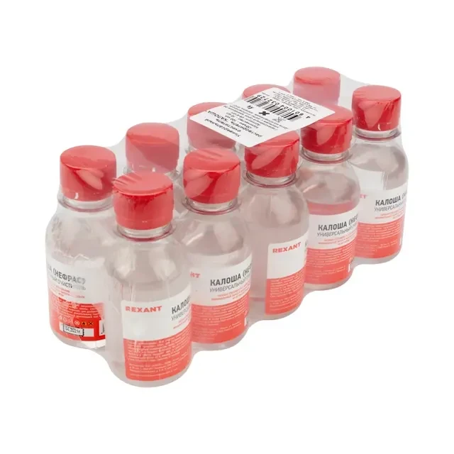 Универсальный растворитель-очиститель КАЛОША 100 мл REXANT предназначен для обезжиривания поверхностей, заправки зажигалок, разбавления красок, очистки различных механизмов от загрязнений, промывки печатных плат, изготовления быстросохнущих масляных лаков и красок, а также других всевозможных целей. Широко применяется в качестве жидкого топлива в зажигалках, паяльных лампах, бензовоздушных горелках, а также в производстве резиновых изделий. Очиститель (нефрас или бензин-калоша) представляет собой бесцветную прозрачную жидкость, которая быстро испаряется, не оставляя пятен на очищаемых поверхностях. Популярность этого вещества в качестве растворителя объясняется довольно сильными растворяющими способностями. Нефрас оказывает малое негативное воздействие на человеческий организм, по сравнению со многими другими видами растворителей. Меры предосторожности: При попадании на кожные покровы промыть теплой водой с мылом. Работы проводить в хорошо проветриваемом помещении. Хранить в дали от различных источников тепла и электрических устройств, не допуская попадания прямых солнечных лучей.
