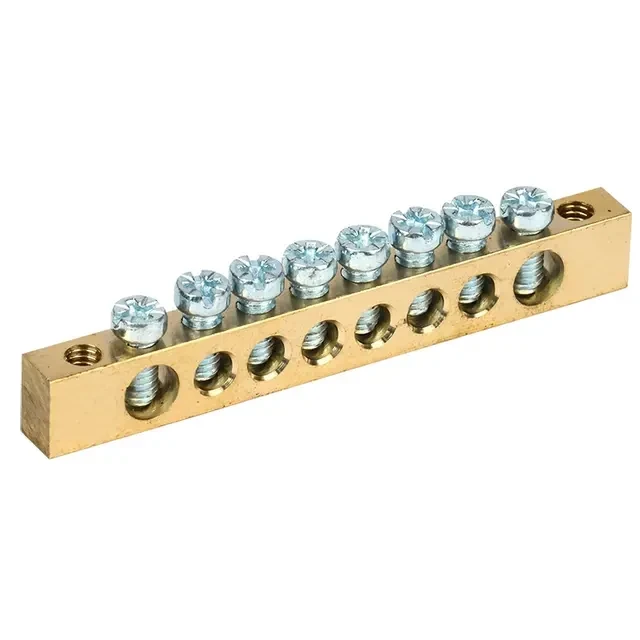 Шина земля-ноль PEN без изолятора предназначена для электрического и механического соединения нулевых, защитных и фазных проводников. Применяется для установки на токоведущую шину в промышленных щитах или на специальный суппорт в модульных шкафах. Крепление осуществляется по краям. Шина выполнена из высококачественной латуни с содержание меди не ниже 58%, что гарантирует надежное электрическое соединение и высокую стойкость к коррозии. Винты на шине имеют скругленную контактную часть, которая предотвращает срез проводника при затяжке. Среднее значение относительной влажности при эксплуатации не должно превышать более 90%.