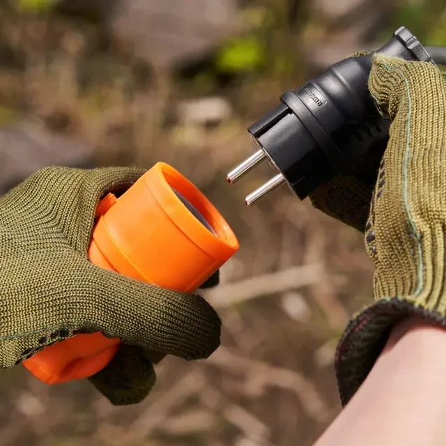 Влагозащищенная вилка предназначена для подключения бытовых и профессиональных приборов к электросети. Вилка разработана для использования в сложных эксплуатационных условиях с высокой влажностью. Широко применяется в быту, на производстве и в строительстве. Степень защиты IP44 позволяет использовать вилку для организации электропитания под открытым небом, а в дождь – под навесом. Не допускается погружение в воду. Для обеспечения безопасности детали, соприкасающиеся с токоведущими частями выполнены из огнеупорного материала, устойчивого к температуре до +850 ⁰С. Ударопрочный разборный корпус выполнен из каучука: устойчив к ударам, вибрациям и другим механическим воздействиям. Заземление: есть. Сечение проводников: 0,75-2,5 мм². Контактная группа: MS-58 (латунь). Тип полюсов: 2Р+РЕ.