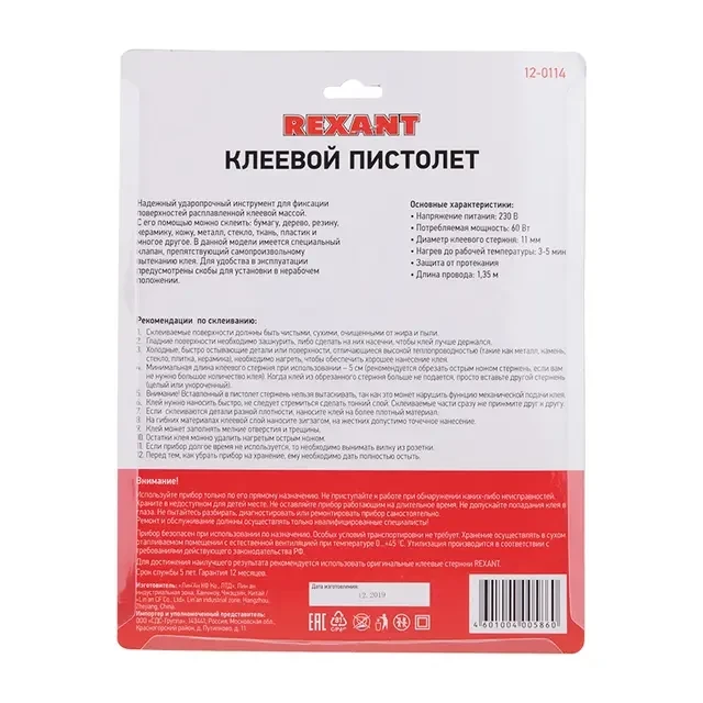 Описание REXANT 12-0114 - Купить Пистолет клеевой
