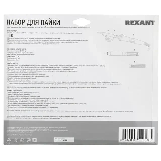 Набор для пайки REXANT позволит эффективно, быстро и самостоятельно отремонтировать электротехнику или произвести монтаж оборудования. В набор входит: Импульсный паяльник 30/70 Вт – имеет длинное тонкое жало, которым можно произвести пайку даже в трудно доступных местах. Жало быстро разогревается до нужной температуры. Подставка под паяльник стальная с ложементом под губку для удаления припоя делает работу с инструментом более удобной, безопасной и продуктивной. Она позволяет уберечь паяльное жало от соприкосновения с другими предметами, в том числе исключая случайные ожоги. Спиралевидный держатель паяльника с хромовым покрытием. Оловоотсос (экстрактор припоя), представляет собой цилиндр с поршнем. Удаляет остатки припоя по завершению работ, не повредив контакты. Припой с канифолью в колбе. Простая конструкция и высококачественное исполнение позволят даже новичку без труда справиться с пайкой различных изделий.