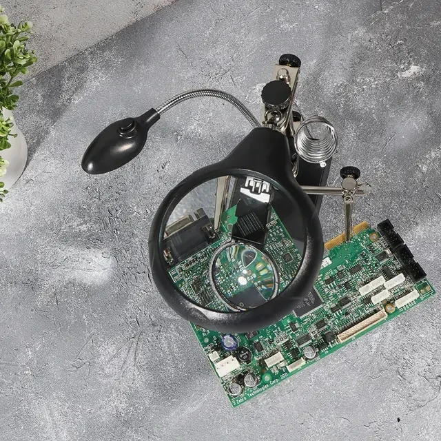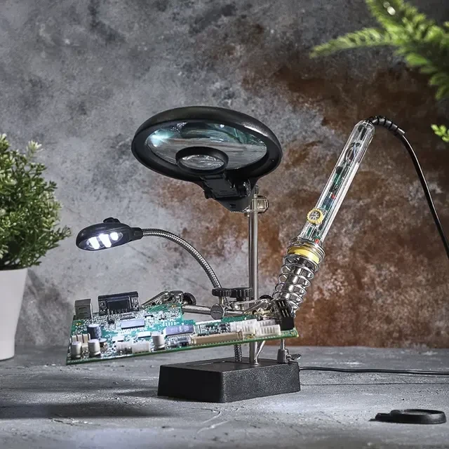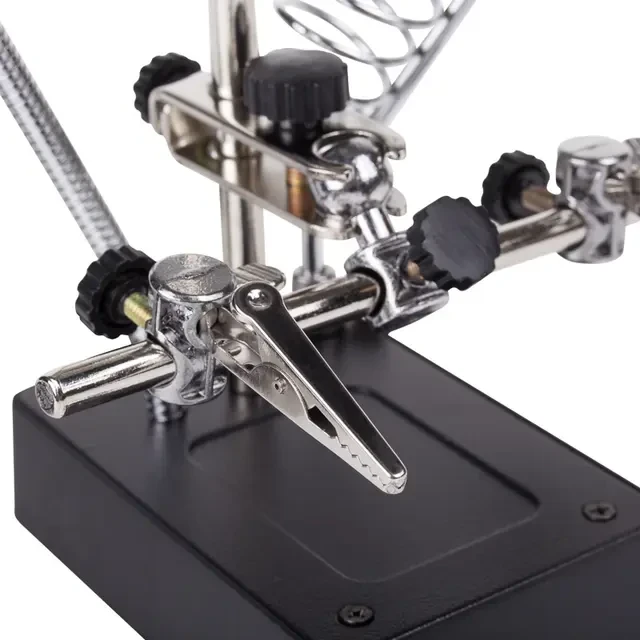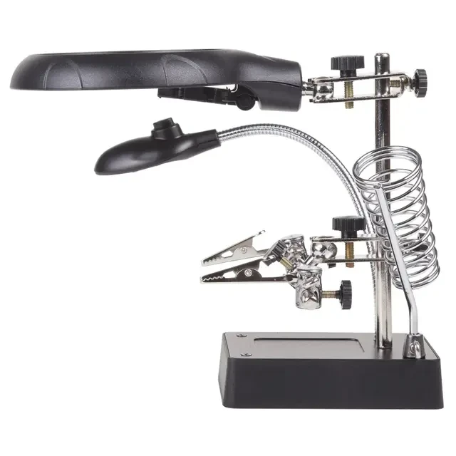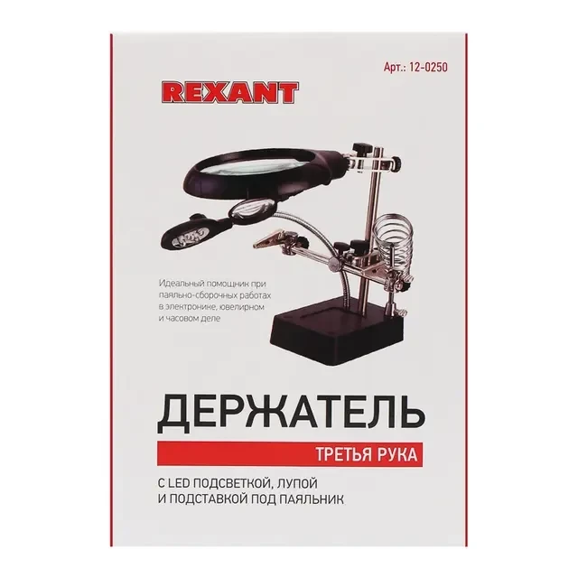 Держатель «третья рука» с лупой х2.5 + х7.5, подставка под паяльник, LED подсветка служит главным образом при проведении паяльно-сборочных работ в электронике, ювелирном деле, сборке и ремонте для зажима мелких деталей в любом нужном положении, когда не хватает двух рук. Инструмент состоит из основания (подставка), шарнирного соединения с зажимами типа «крокодил» (подвижных во всех плоскостях, с никелевым покрытием), трёх луп с кратностью увеличения 2.5x (диаметр 90 мм), 7.5x (диаметр 34 мм) и 10x (диаметр 34мм), а также модуля подсветки. В данной модели реализована подсветка от двух альтернативных источников: 3 батарейки типа АА (не поставляются в комплекте) и блока питания (в комплекте). С помощью лупы можно будет рассмотреть даже самые мелкие детали. Размер в упаковке: 170x117x93 мм. Размер товара без упаковки в раскрытом виде: 245x198x120 мм.