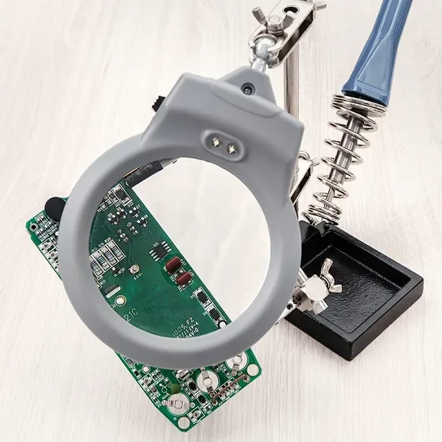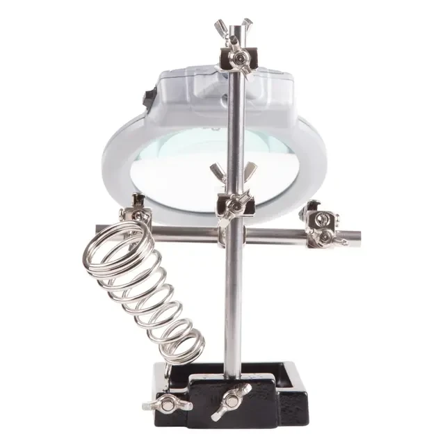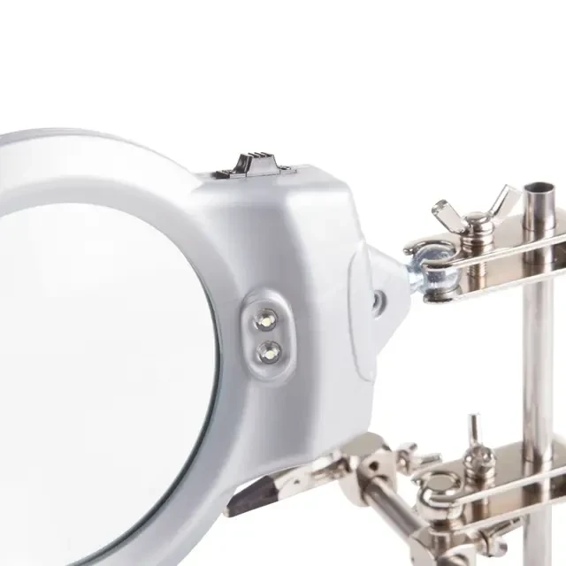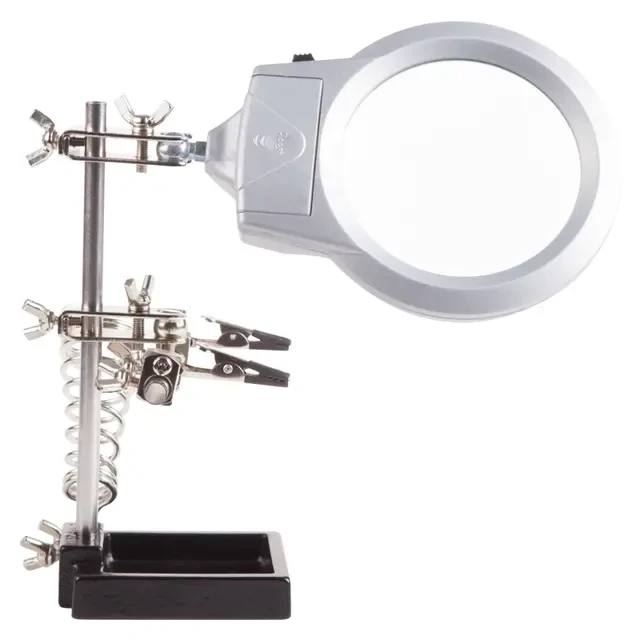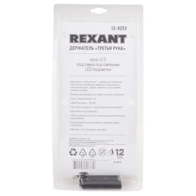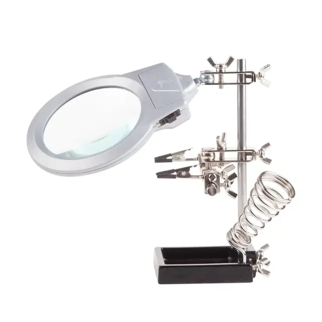 Держатель «третья рука» с подставкой под паяльник и лупой х2.5 с LED подсветкой REXANT служит главным образом при проведении паяльно-сборочных работ в электронике, ювелирном деле, сборке и ремонте для зажима мелких деталей в любом нужном положении, когда не хватает двух рук. Инструмент состоит из чугунного основания (тяжелая подставка с нишей для мелких деталей или припоя), двух подвижных зажимов типа «крокодил» с никелевым покрытием, лупы х2.5 со светодиодной подсветкой (возможность регулировки положения, диаметр линзы 85 мм) и спиралевидной подставки под паяльник с никелевым покрытием. LED подсветка интегрирована в держатель линзы и дает возможность работать в помещениях с плохой освещенностью (питание от ААА х 3 шт.). С помощью лупы можно будет рассмотреть даже самые мелкие детали.