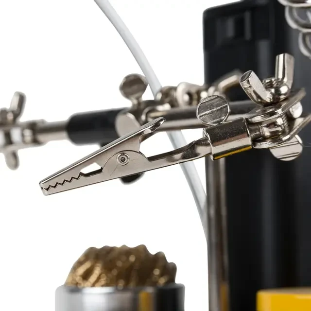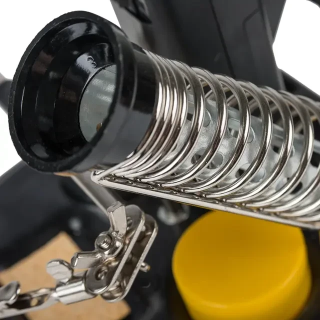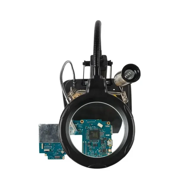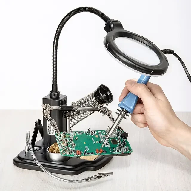Держатель «третья рука» ПРОФИ с лупой х3, подставка под паяльник, LED подсветка, стенд для припоя REXANT служит главным образом при проведении паяльно-сборочных работ в электронике, ювелирном деле, сборке и ремонте для зажима мелких деталей в любом нужном положении, когда не хватает двух рук. Инструмент состоит из: Основания (тяжелая подставка с нишами для предметов). Двух подвижных зажимов на трубке типа «крокодил» с никелевым покрытием. Зажима на длинной регулируемой стойке с никелевым покрытием. Лупы с LED подсветкой (возможность регулировки положения). Спиралевидной подставки под паяльник с никелевым покрытием. Держателя припоя на катушках. Кроме этого, в комплекте поставляется: губка для очистки паяльного жала, канифоль в баночке и шар из медной стружки для сухой очистки жала. LED подсветка интегрирована в держатель линзы и дает возможность работать в помещениях с плохой освещенностью. С помощью лупы можно будет рассмотреть даже самые мелкие детали. Линза изготовлена из стекла, что обеспечит наиболее четкое изображение с минимальным уровнем искажений. Основные характеристики: Габаритные размеры: 190х170 мм Диаметр линзы: 90 мм Кратность увеличения: 3х Губка для очистки паяльного жала: 30х50 мм Источник питания подсветки: 4 батареи, тип АА (либо через адаптер питания DC 6V / 0.5 А, не поставляется в комплекте) Цвет корпуса: черный. Данный инструмент необходим не только любому специалисту для выполнения работ с высокой точностью и безопасностью для клиента, но также будет незаменим в быту.