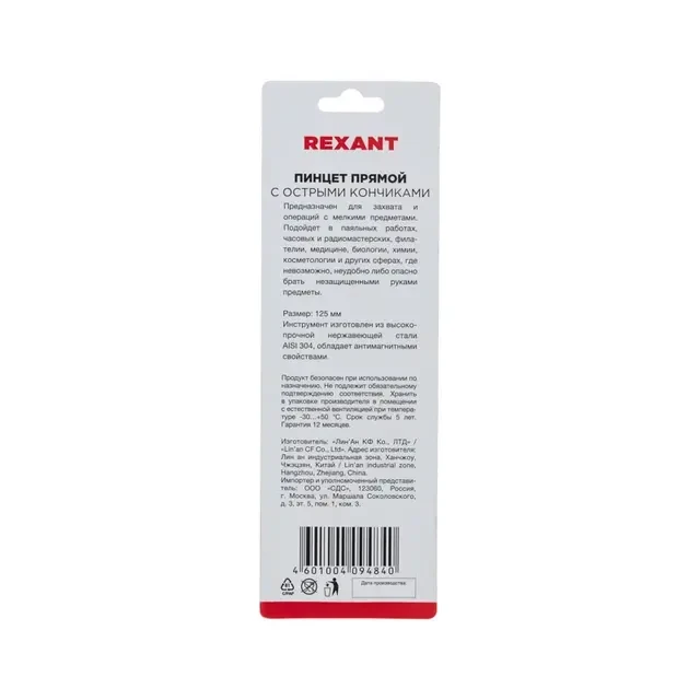 Пинцет прямой с острыми кончиками 125мм (блистер) REXANT