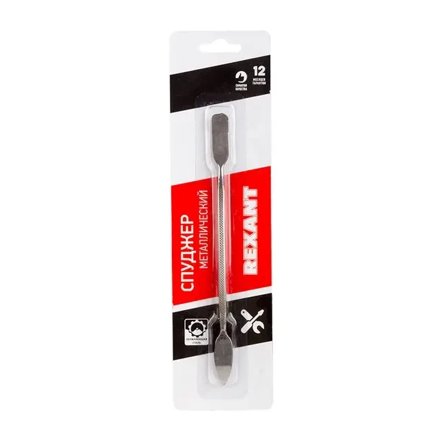 Спуджер металлический REXANT представляет собой цельную конструкцию. Предназначен для разборки корпусов смартфонов, ноутбуков, планшетов. Металлическая двухсторонняя лопатка пригодится как на работе, так и в быту. С ее помощью можно вскрыть клавиатуру ноутбука или подцепить глубоко расположенную батарейку. Рабочие поверхности увеличенные: широкая и заостренная. Инструмент выполнен из качественной высокоуглеродистой стали, устойчивой к образованию ржавчины, что обеспечивает долгий срок службы. Благодаря особому исполнению рукоятки спуджер не скользит в ладони.