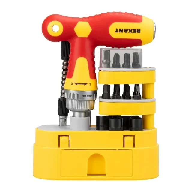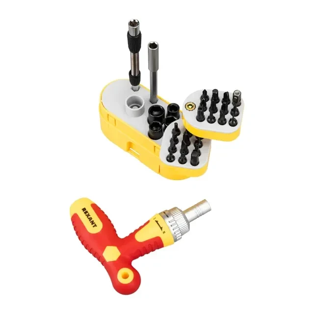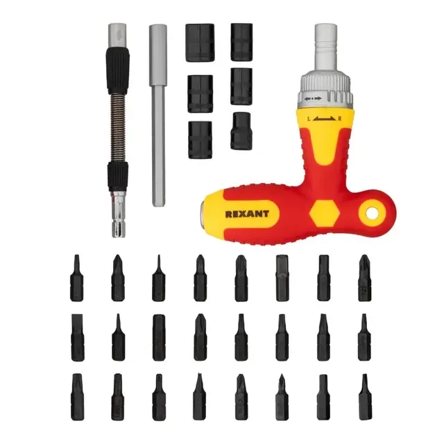 Набор отверток REXANT 33 в 1 применяется для монтажа и демонтажа винтов, шурупов, саморезов и других крепежных изделий. Биты выполнены из качественной хромованадиевой стали. Т-образная отвертка 2 в 1 оснащена реверсивным механизмом (реверс по часовой стрелке/против часовой стрелки/фиксация), а также стандартным отверстием под насадки для создания классического инструмента. В основании есть отверстие, которое может использоваться для создания дополнительного рычага усилия при работе, если установить в него металлический пруток. Двухкомпонентная рукоятка оснащена магнитным держателем, что обеспечивает быструю замену и надежную фиксацию бит. Для удобства хранения и транспортировки набор поставляется в органайзере, который оснащен отсеком для хранения мелкого крепежа. Комплектация: Шестигранная звезда: T5, T6, T10, T15, T20, T25, T30 Шестигранник: H3, H4, H5, H6 Крестовая: PZ2, PZ3 Крестовая: PH0, PH1, PH2 Шлицевая: SL3, SL5, SL6 Tri-Wing (трехлистник): Y2, Y3 Треугольный шлиц: 2.3 U6.0 Головки: M6, M7, M8, M9, M10, M11 Жесткий удлинитель Гибкий удлинитель Адаптер
