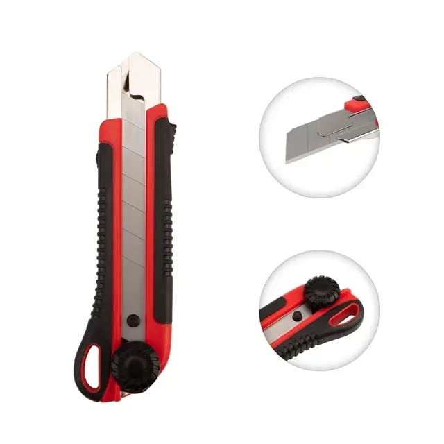 Нож с выдвижным сегментированным лезвием REXANT предназначен для реза различных материалов: пластика, линолеума, кровельных материалов, гипсокартонных и гипсолитовых плит, бумаги, картона. Прочный корпус инструмента из ABS-пластика обладает удобной обрезиненной рукояткой, что увеличивает его эксплуатационные свойства. Стальное лезвие фиксируется автоматически, также предусмотрен дополнительный замок. Когда крайний сегмент затупляется, его можно отломить и продолжить использовать инструмент. Качественные материалы обеспечивают долгий срок службы инструмента. Замена лезвия осуществляется вручную.