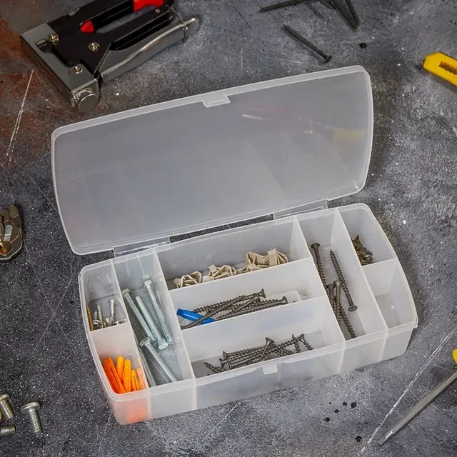 Ящик для инструментов PROconnect выполнен из прочного пластика. Обладает 9 отделениями для небольших принадлежностей. Функциональный ящик предназначен для хранения и транспортировки инструментов, крепежных изделий, расходных материалов, в том числе различных предметов, схожих по габаритам. Удобный замок плотно прижимает крышку к корпусу; открывается и закрывается одной рукой. Полупрозрачные крышка и корпус обеспечивают дополнительное удобство при хранении. Характеристики: Размеры: 260х120х55 мм Количество отделений: 9 шт. Материал: полипропилен Цвет: белый Преимущества: Полупрозрачная крышка позволяет сразу увидеть, в каком отсеке находятся необходимые предметы Подходит для бытового и профессионального использования Выполнен из прочных долговечных материалов