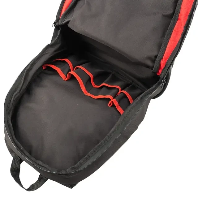 Рюкзак монтажника с резиновым дном REXANT RE-12 оснащен 12 карманами и предназначен для комфортной транспортировки инструментов. Выполнен из водонепроницаемого комбинированного материала, пропитанного полиуретановым составом и поливинилхлоридом, который используют в изготовлении тентов для шатров, торговых палаток и различного снаряжения для туристических поездок. Характеристики: Габариты: 32.5х17.5х42.5 см Материал: ткань «Оксфорд» 600D PVC PU Максимальный выдерживаемый вес: до 10 кг Вес рюкзака: 1.65 кг Цвет: черный, красный Преимущества: Переднее и заднее внутреннее отделения оснащены отдельными молниями Широкие мягкие регулирующиеся лямки и поясной ремень Надежная ручка для переноски Мягкие анатомические вставки на спинке рюкзака Водозащитное резиновое дно с высокими бортиками Прочные усиленные молнии с крупными звеньями