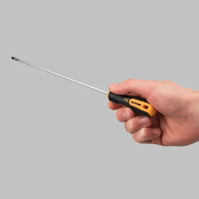 Отвертка шлицевая REXANT используется для монтажа и демонтажа резьбовых соединений (шурупов, саморезов), имеющих на головке прямой паз. Оснащена эргономичной двухкомпонентной рукояткой, которая предотвращает скольжение в ладони и обеспечивает более комфортную работу. Инструмент обладает стержнем, который изготовлен из высококачественной хромованадиевой стали, характеризующейся высокой стойкостью к коррозии. Благодаря оксидированному намагниченному наконечнику крепежная деталь не упадет при извлечении или установке. В основании инструмента предусмотрено отверстие для его подвеса.