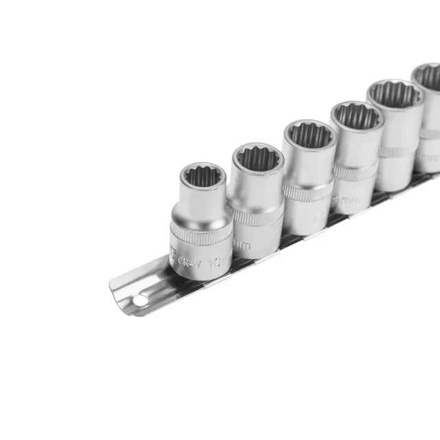 Набор головок REXANT используется для монтажа и демонтажа резьбовых соединений. Широко применяется при ремонте автомобилей и различного оборудования. Инструменты изготовлены из хромованадиевой износостойкой и долговечной стали с хромоникелевым покрытием. В наборе 10 съемных торцевых головок: 10, 12, 13, 14, 15, 16, 17, 19, 22 и 24 мм, которые имеют 12-гранный зев. Это позволяет осуществлять вращение крепежа с меньшим углом поворота (30 градусов) по сравнению с 6-гранным зевом. Ярко-красная полоска, нанесенная на головки, предназначена для удобного поиска. Изделия поставляются на металлической планке и упакованы в блистер.