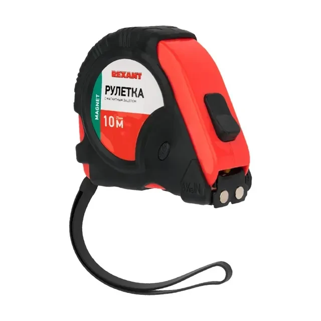 Измерительная рулетка REXANT Профи необходима при проведении измерительных работ в строительстве, хозяйстве, ландшафтных и геодезических исследованиях. Двухкомпонентный прорезиненный корпус, выполненный из ударопрочного пластика, не скользит в руках. Прочное полотно без изломов имеет глянцевое покрытие и обладает удобным зацепом с магнитами. Для удобства использования предусмотрены кнопки стопора и фиксации тормоза. На корпусе расположена клипса-зажим для фиксации рулетки на ремне, кармане или поясной сумке. Ремешок позволяет надевать инструмент на запястье, чтобы освободить руки для работы.