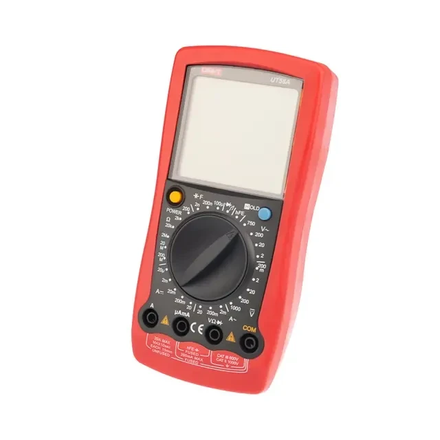 UT58A — это профессиональный мультиметр с современным и эргономичным дизайном. Предназначен прибор для измерений постоянного и переменного напряжения, сопротивления, постоянного и переменного тока. Кроме того, он имеет функции измерения электрической емкости, а также с его помощью вы сможете тестировать диоды и проводить прозвонку целостности цепи. Данный прибор обладает высоким классом точности показаний. Широкий функционал мультиметра UT58A позволяет обходиться без других вспомогательных устройств. Прибор оснащен функцией DATA HOLD, и зафиксировав результат измерений, вы в любое время сможете считать полученный значение. Прибор изготовлен из высококачественных материалов. Калибровка и тестирование приборов произведены под контролем компании СДС. Инженеры старались сделать прибор максимально удобным для использования, и сужение в нижней области корпуса позволяет удобнее располагать прибор в одной руке, а шероховатость корпуса предотвращает выскальзывание. Все переключения удобно производить даже одной рукой, но, несмотря на это, у прибора усиленный поворотный регулятор, благодаря которому исключается возможность случайного нажатия. Характеристики: Постоянное напряжение: 200 мВ/2 В/20 В/200 В/1000 В: ± (0. 5% + 1) Переменное напряжение: 2 В/20 В/200 В/750 В: ±(0.8%+3) Постоянный ток: 20 Μa/2 мА/20 мA/200 мА/20А (0,8%+1) Переменный ток: 2 мА/200 мА/20А (1%+3) Сопротивление: 200 Oм/2 kOм/20 kOм/2 мOм/20 мOм/200 мOм (0,8%+1) Емкость: 2 нФ/200 нФ/100 мФ (4%+3) Дисплей: 2000 Ручная установка диапазона измерений Тестирование диодов Автовыключение Режим удержания измерений DATA HOLD Прозвонка целостности цепи Индикатор разряда батареи Импеданс: около 10 МОм Размер: 179х88х39 мм Тип батареи: 9 В батарея Комплект поставки: тестер, чехол, щупы, инструкция, батарея