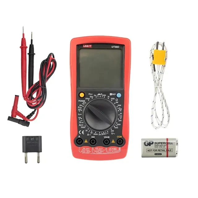 UT58D — это профессиональный мультиметр с современным и эргономичным дизайном. Предназначен прибор для измерений постоянного и переменного напряжения, сопротивления, постоянного и переменного тока. Кроме того, он имеет функцию измерения электрической емкости, а также с его помощью вы сможете тестировать диоды и проводить прозвонку целостности цепи. Мультиметр 58D может измерять индуктивность до 20 генри, что не часто можно встретить в этом классе мультиметров. Данный прибор обладает высоким классом точности показаний. Дисплей прибора оснащен подсветкой, которая позволяет проводить измерения даже в слабоосвещенных местах. Широкий функционал мультиметра UT58D позволяет обходиться без других вспомогательных устройств. Прибор оснащен функцией DATA HOLD, и зафиксировав результат измерений, вы в любое время сможете считать полученный значение. Прибор изготовлен из высококачественных материалов. Калибровка и тестирование приборов произведены под контролем компании СДС. Инженеры старались сделать прибор максимально удобным для использования, и сужение в нижней области корпуса позволяет удобнее располагать прибор в одной руке, а шероховатость корпуса предотвращает выскальзывание. Все переключения удобно производить даже одной рукой, но, несмотря на это, у прибора усиленный поворотный регулятор, благодаря которому исключается возможность случайного нажатия. Характеристики: Постоянное напряжение: 200 мВ/20 В/200 В/1000 В: ± (0. 5% + 1) Переменное напряжение: 2 В/200 В/1000 В: ±(0.8%+3) Постоянный ток: 2 мА/20 мA/20 А (0,8%+1) Переменный ток: 2 мА/20 мA/20 А (1%+3) Сопротивление: 200 Oм/2 kOм/20 kOм/2 мOм/20 мOм (0,8%+1) Емкость: 20 нФ/200 нФ/2 мФ/100 мФ ± (2. 5% + 5) Индуктивность: 2 мГ/20 мГ/200 мГ/20 Г ±(2%+10) Дисплей: 2000 Ручная установка диапазона измерений Тестирование диодов Автовыключение Режим удержания измерений DATA HOLD Прозвонка целостности цепи Индикатор разряда батареи Импеданс: около 10 МОм Размер: 179х88х39 мм Тип батареи: 9 В батарея Комплект поставки: тестер, чехол, щупы, инструкция, батарея, щупы с зажимами типа крокодил