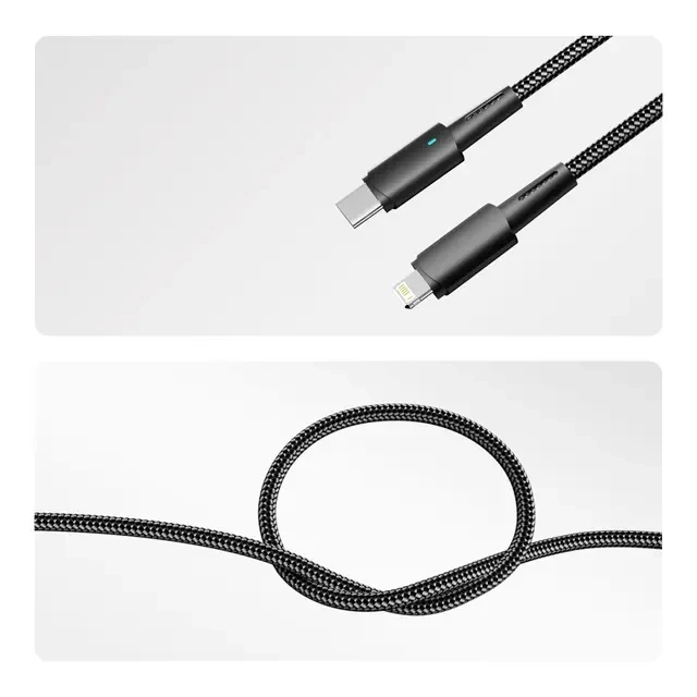 Кабель предназначен для зарядки электронных устройств, а также их синхронизации с ПК или ноутбуками. С одной стороны изделия расположен разъем USB-С, а с другой – разъем Lightning. Изделие выполнено из нейлонового плетеного провода высокой плотности, что обеспечивает защиту от перегибов и заломов. Цвет – черный. Кабель поддерживает стандарт быстрой зарядки Power Delivery и имеет выходную мощность 27 Вт с силой тока 3А. Скорость передачи данных составляет до 480 Мбит/с. На штекере кабеля предусмотрена световая индикация, которая облегчает поиск устройства в ночное время. Длина кабеля равна 1 м, что позволяет заряжать устройство и передавать данные на комфортном расстоянии для пользователя.