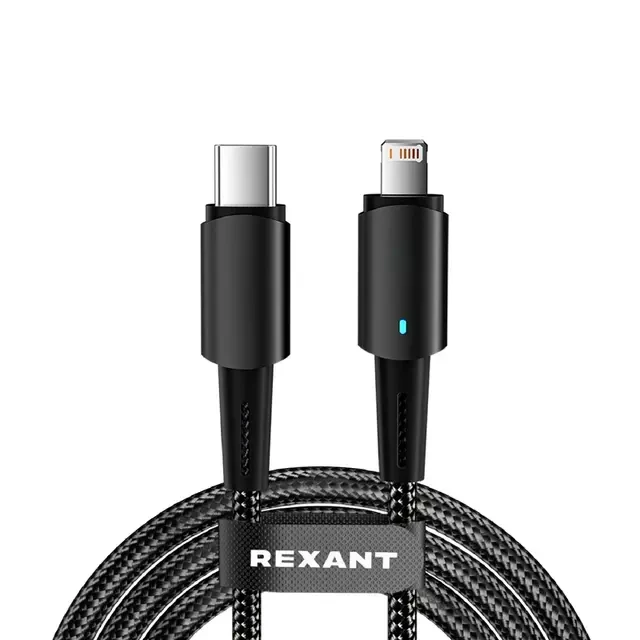 Кабель Type-C – Lightning, 3А, 1м, в черной нейлоновой оплетке, со световой индикацией REXANT
